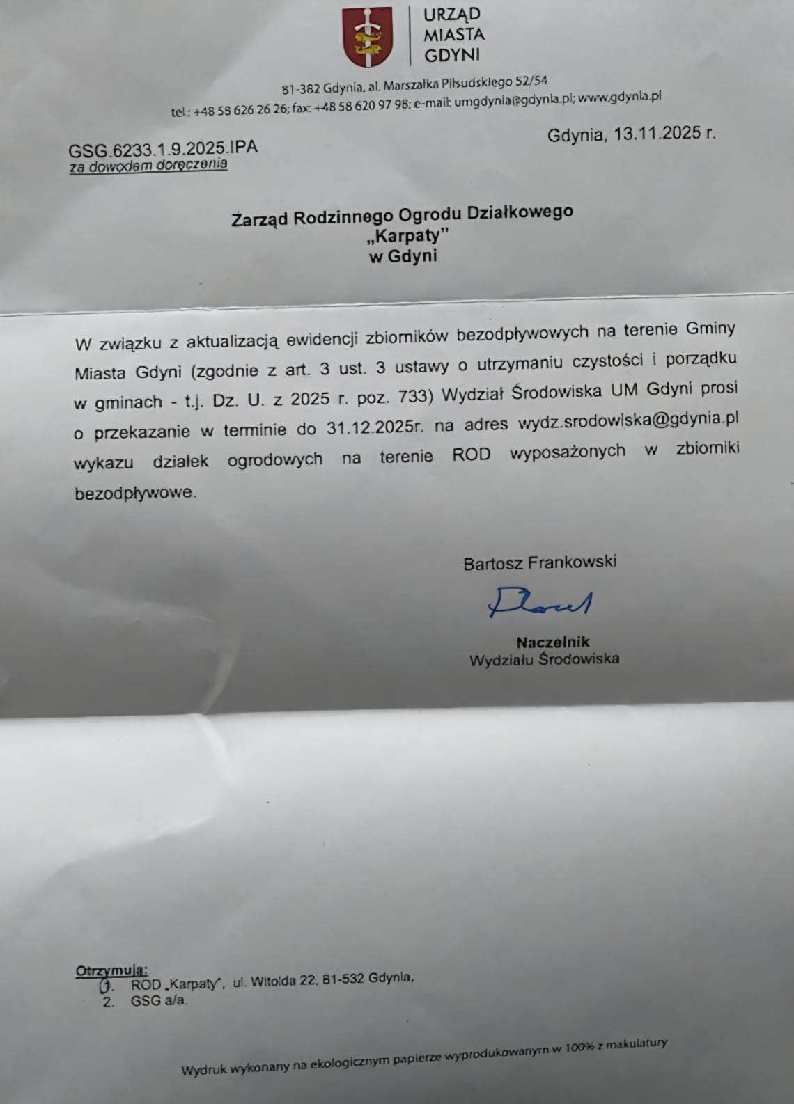 W związku z aktualizacją ewidencji zbiorników bezodpływowych na terenie Gminy Miasta Gdyni (zgodnie z art. 3 ust. 3 ustawy o utrzymaniu czystości i porządku w gminach - t.j. Dz. U. z 2025 r. poz. 744) Wydział Środowiska UM Gdyni prosi o przekazanie w terminie do 31.12.2025r. na adres wydz.srodowska@gdynia.pl wykazu działek ogrodowych na terenie ROD wyposażonych w zbiorniki bezodpływowe.